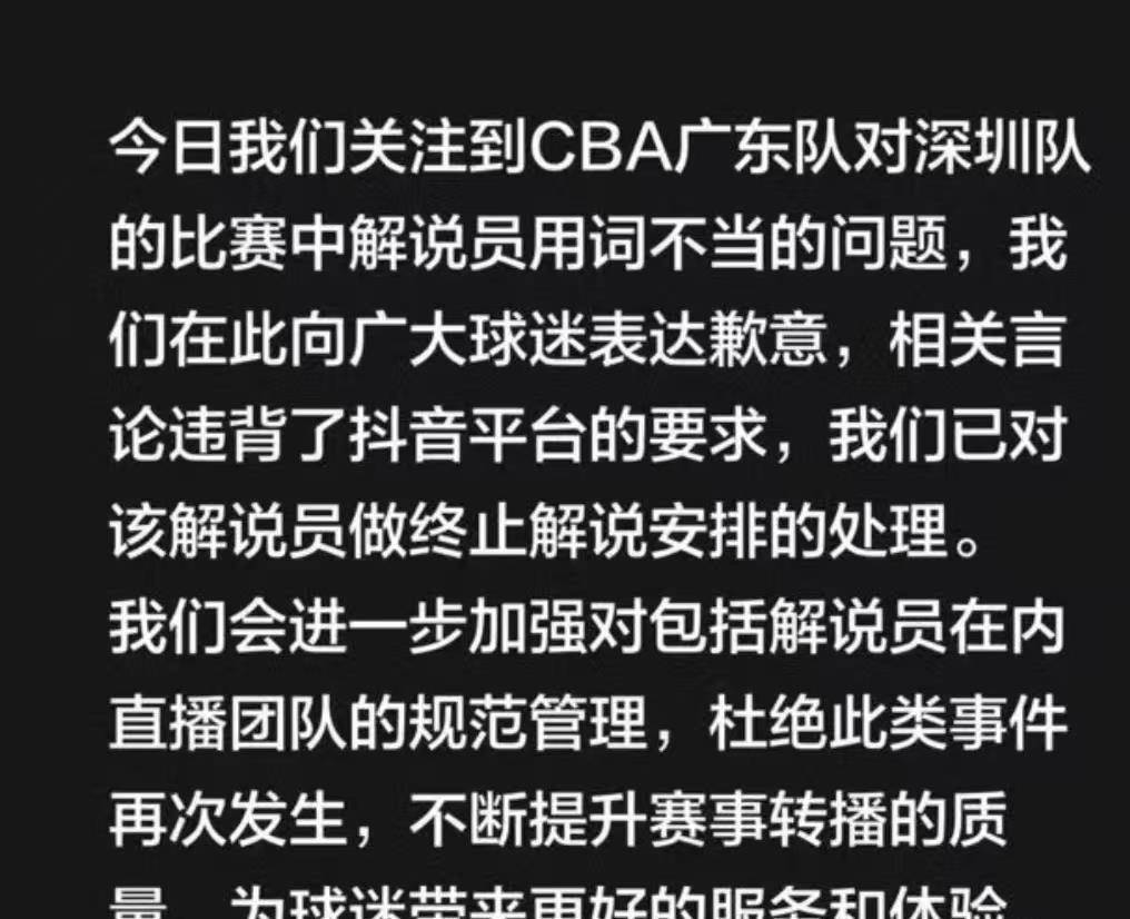 抖音体育的反应速度很快。 在比赛结束后的深夜12点整,官方账号发布了道歉声明,全文如下:“我们关注到CBA广东队对深圳队的比赛中解说员用词不当的问题,我们在此向广大球迷表达歉意,相关言论违背了抖音平台的要求,我们已对该解说员做终止解说安排的处理。 我们会进一步加强对包括解说员在内直播团队的规范管理,杜绝此类事件再次发生,不断提升赛事转播的质量。 ”这份声明发布的时间点选在午夜,显然是为了尽快平息风波,但球迷们并不买账。 声明下面的评论区堆满了质疑,最高赞的留言写道:“光道歉有什么用? 解说员本人不出来认错吗? ”还有球迷建议平台引入更严格的解说员考核机制,不能只看流量。