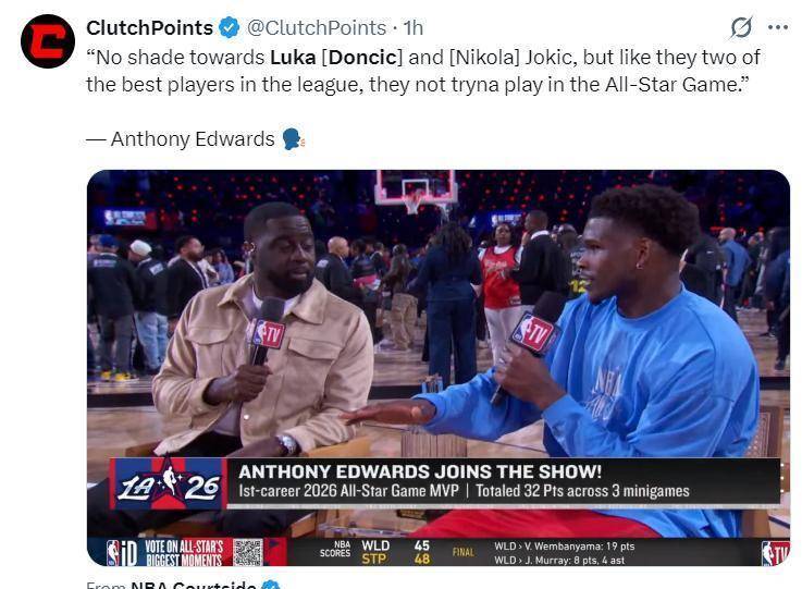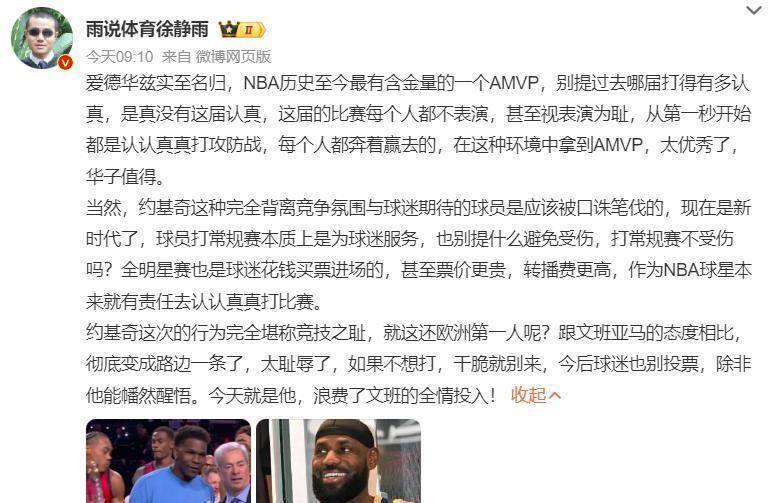 与此同时,其他球星在全明星赛上的表现也被拿来与东契奇和约基奇进行对比。 科怀·伦纳德在代表条纹队出战的比赛中,一度在单节比赛中狂砍31分,几乎以一己之力带动比赛节奏。 勒布朗·詹姆斯和凯文·杜兰特虽然年纪已大,但在场上依然认真传导球,努力防守,为年轻球员做榜样。 安东尼·爱德华兹、泰雷斯·马克西等年轻球员更是每球必争,将12分钟的比赛当作季后赛来打。 这些人的态度,让东契奇和约基奇那5分05秒的“散步”显得更加突兀和难以理解。